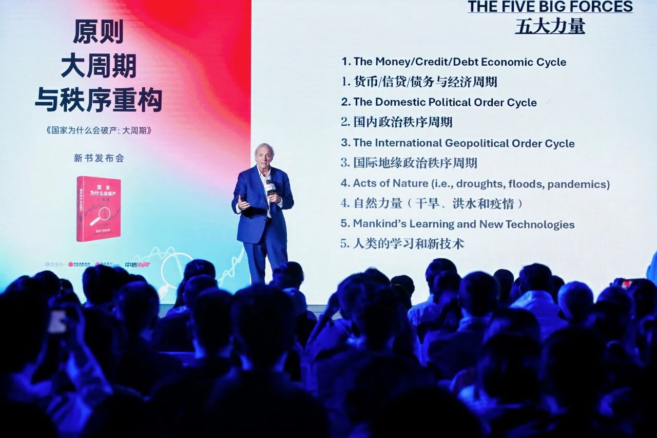 达利欧在随后发表的主题演讲中指出,历史中反复出现的国家兴衰与秩序更迭,主要由五大力量共同驱动:债务/信贷/货币/经济周期、国内政治秩序周期、国际地缘政治周期、自然力量以及人类的学习和新技术。他表示,当前多国面临债务高企、偿债压力攀升的挑战,需通过“和谐的去杠杆化”等方式实现软着陆。
