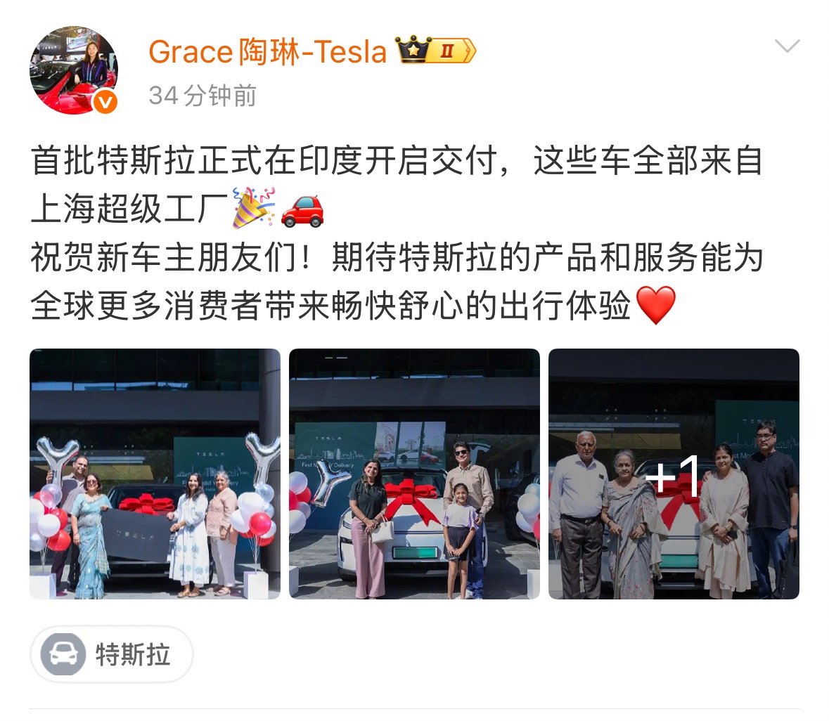 上证报中国证券网讯 特斯拉公司副总裁陶琳27日在个人微博宣布,首批特斯拉正式在印度开启交付,这些车全部来自上海超级工厂。
