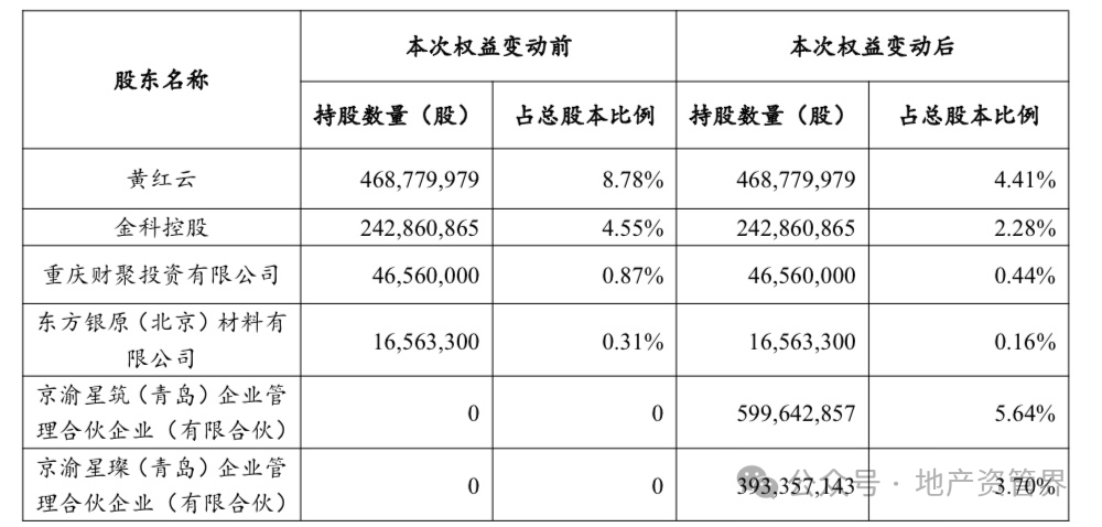 根据相关协议,上海品器联合体指定其实际控制的京渝星筑、京渝星璨接受划转共计9.93亿股转增股票,占公司总股本的9.34%,成为公司第一大股东。
