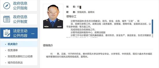 据官网此前介绍,付某,男,1978年9月生,汉族,贵州师范大学法学专业毕业,大学学历,中共党员,现任六盘水市水城区城市管理综合行政执法局副局长,分管市政园林、防汛、安全、应急、招商引资等工作。
