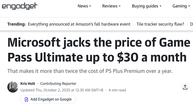 新价格系单月计费,不提供年付或季付折扣选项,360 美元年费约为竞品 PlayStation Plus Premium(160 美元)的2.25 倍。