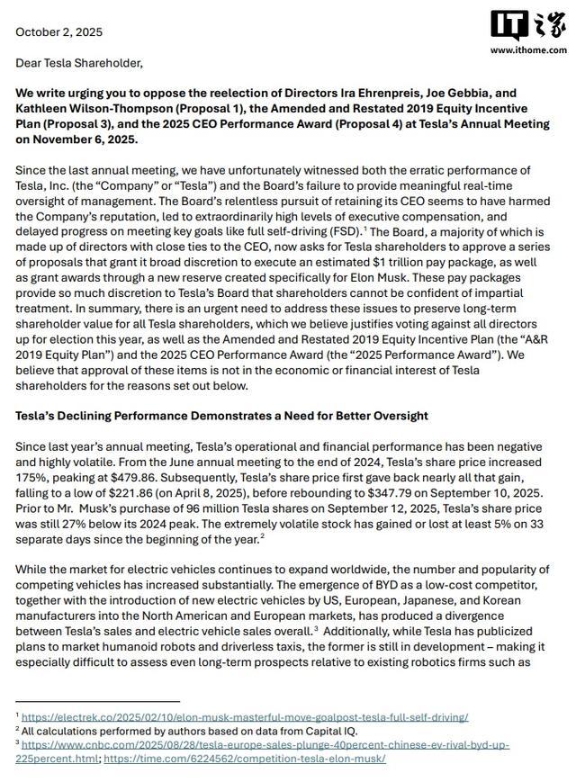 此外,投资者团体反对与马斯克薪酬相关的第 3 号和第 4 号提案。团体批评第 3 号提案将马斯克与员工的股票奖励捆绑在一起,剥夺了股东单独对员工激励方案投票的机会。第 4 号提案,即 1 万亿美元薪酬激励,被认为目标“模糊”“要求过低”,且由“不具独立性的董事会”决定执行方式,缺乏保障。信中还指出,大规模股票奖励可能稀释现有股东权益,并在高波动股价下造成不稳定的价值分配。
