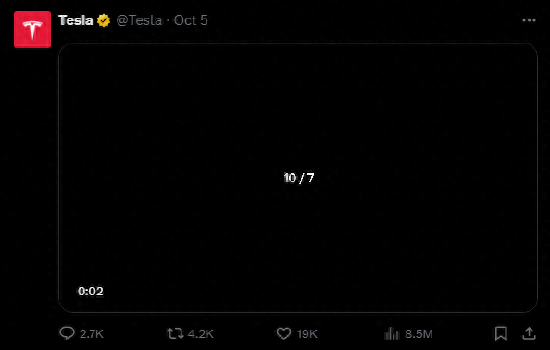 【环球网科技综合报道】10月7日消息,特斯拉日前在社交媒体上发布系列帖文,成功引发了投资者关注,推动股价上涨。公司第一条帖文发布了一段视频,视频中一个印有特斯拉标志、形似轮毂盖的黑色物体加速旋转,随后出现数字“10/7”,可能指的是将于10月7日发布的一款产品。第二条帖文展示的是两盏特斯拉汽车的前照灯在黑暗中闪耀,仿佛是夜空中闪烁的神秘信号。