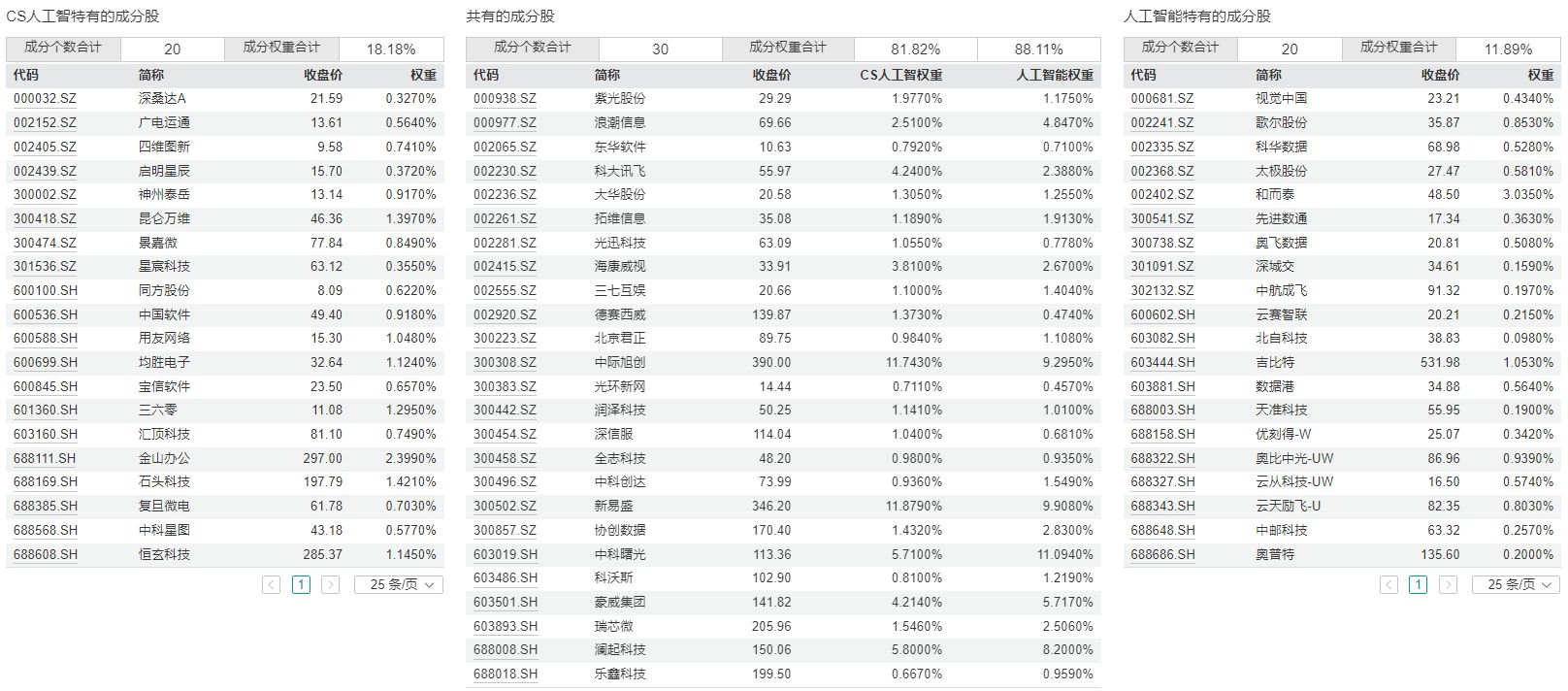 进一步对比两个指数的成分股,可以发现两个指数重合的成分股是30只,各自独有的成分股均是20只。