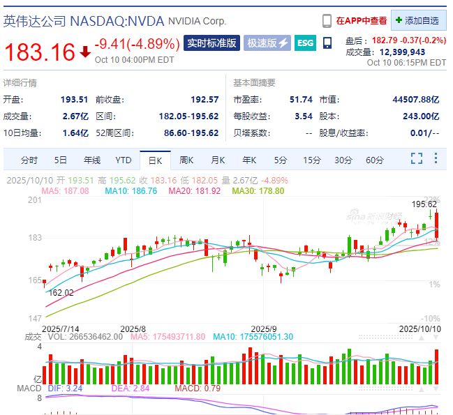 英伟达报183.16美元,跌4.89%,其市值一夜蒸发2287亿美元(16318亿元)。