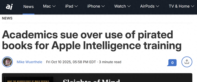 【环球网科技综合报道】10月11日消息,据科技媒体 Appleinsider 报道,美国纽约州立大学健康科学大学的两名学术作者苏珊娜・马丁内斯-康德与斯蒂芬・麦克尼克,近日以版权侵权为由对苹果公司提起集体诉讼,指控其“苹果智能”(Apple Intelligence)AI系统在训练过程中,非法使用包含两人著作盗版内容的数据库,相关案件引发行业对AI训练数据版权合规问题的广泛关注。