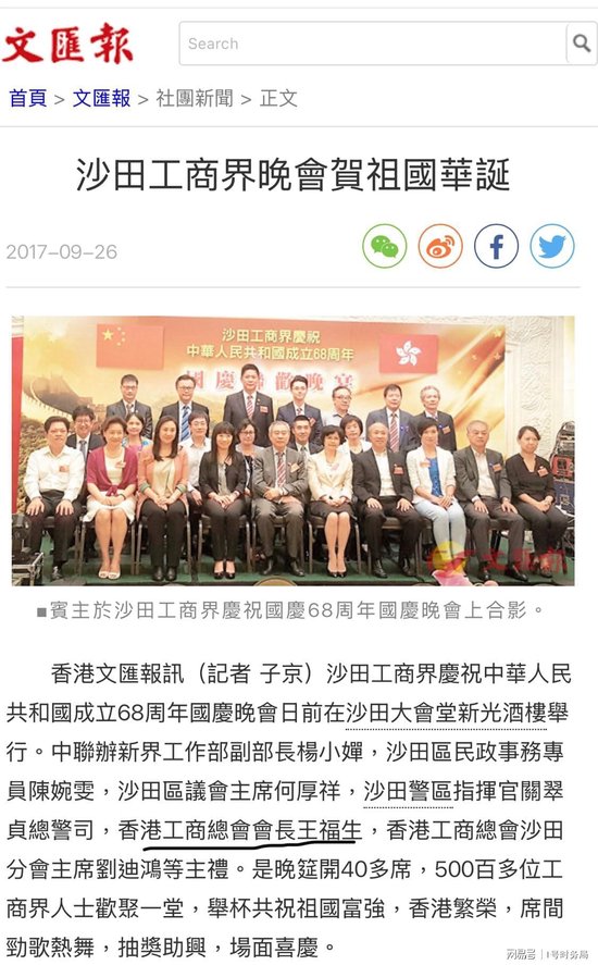 特别是2017年9月26日,香港《文汇报》曾发表公开报道显示,时任香港工商总会会长的王福生一起与数百位香港工商界“名流”以及众多香港政要,共同出席了庆祝新中国成立68年晚会。