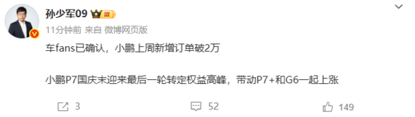【CNMO科技消息】10月13日,有汽车博主爆料称,小鹏汽车上周新增订单量突破2万辆大关。该博主还称,在国庆假期的尾声,全新小鹏P7迎来了最后一轮转定权益高峰,并带动了P7+和G6车型的销量同步上涨。