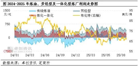 从经济收益来看,炼化一体化的“价值链延伸”效应尤为显著。根据卓创资讯利润模型显示:2025年1—9月,传统炼油模式下的综合炼油利润约34.84元/吨,5月份利润还出现亏损状态,企业经营受成品油价格影响明显,而炼化一体化模式下,将部分成品油进一步裂解为乙烯、丙烯等基础化工原料,再延伸至聚乙烯、聚丙烯、环氧乙烷等下游产品,无论芳烃路线还是烯烃一体化路线综合利润均可提升200~400元/吨,产品附加值进一步提升。