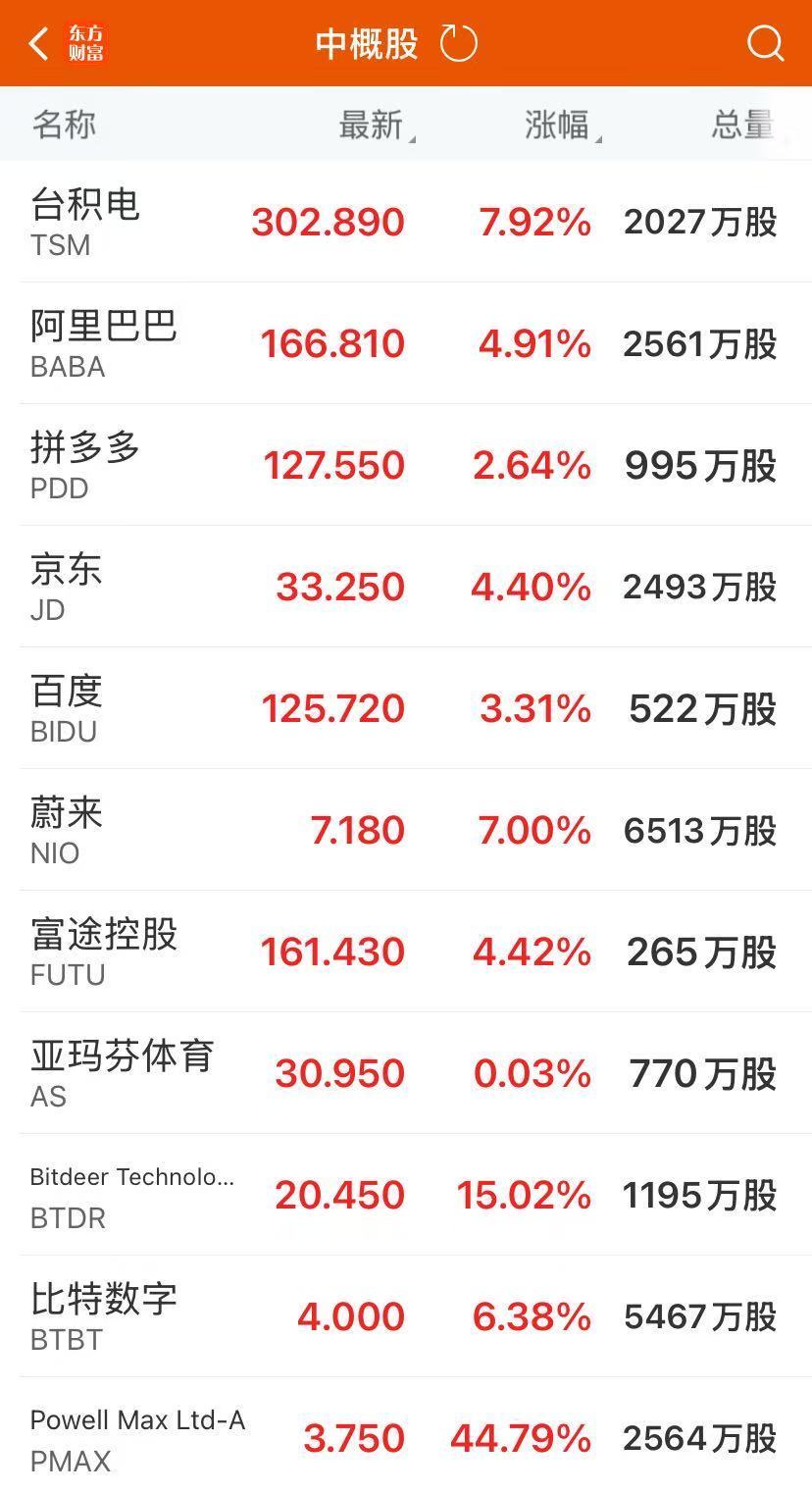 纳斯达克中国金龙指数收涨3.21%,热门中概股普涨,世纪互联涨超10%,蔚来涨7%,名创优品涨超5%,阿里巴巴、京东涨超4%,小鹏汽车、百度涨超3%。