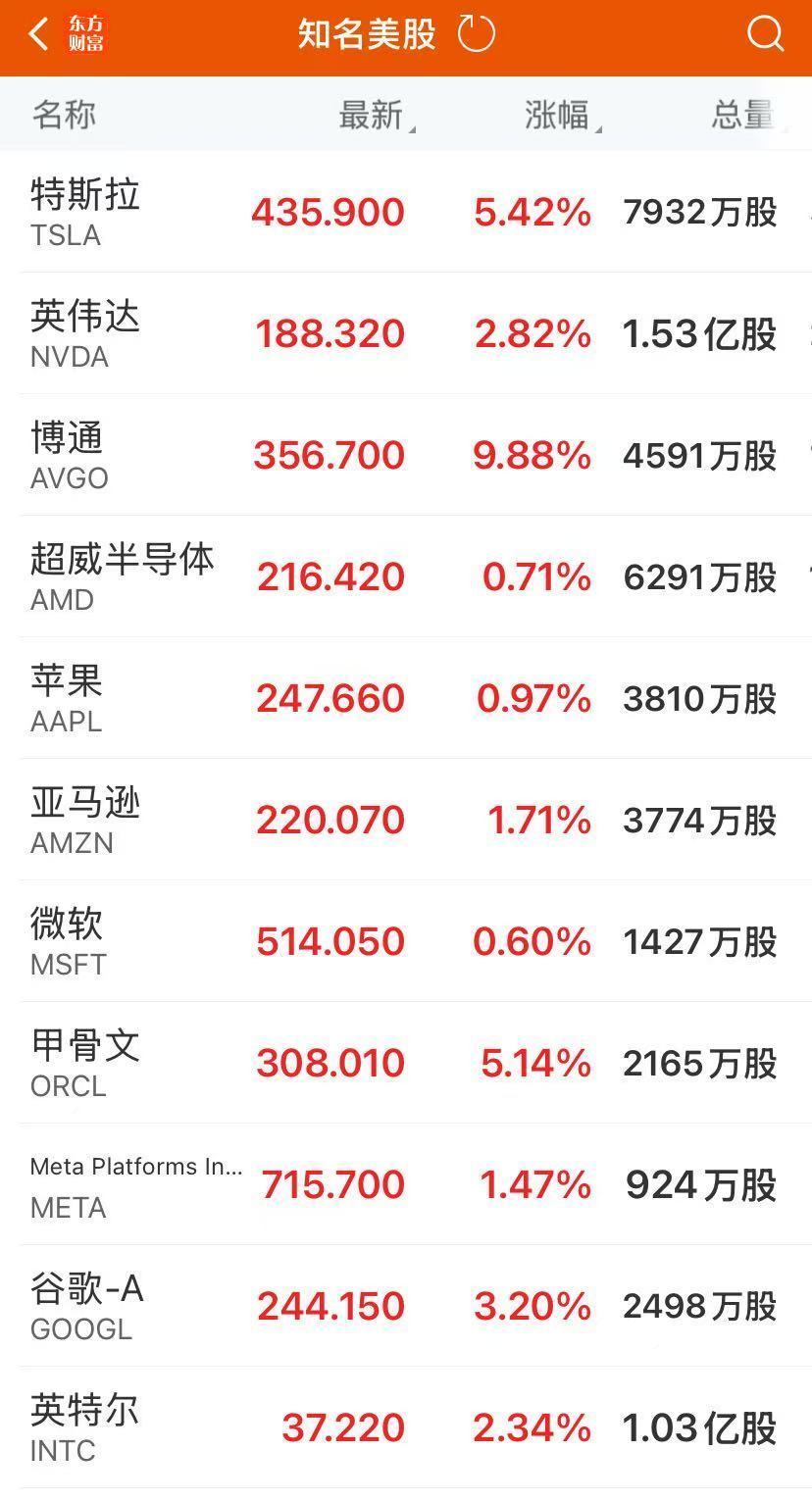 热门科技股普涨,博通涨超9%,特斯拉涨超5%,市值一夜大增745亿美元(约合人民币5320亿元),谷歌涨超3%,英伟达涨超2%。
