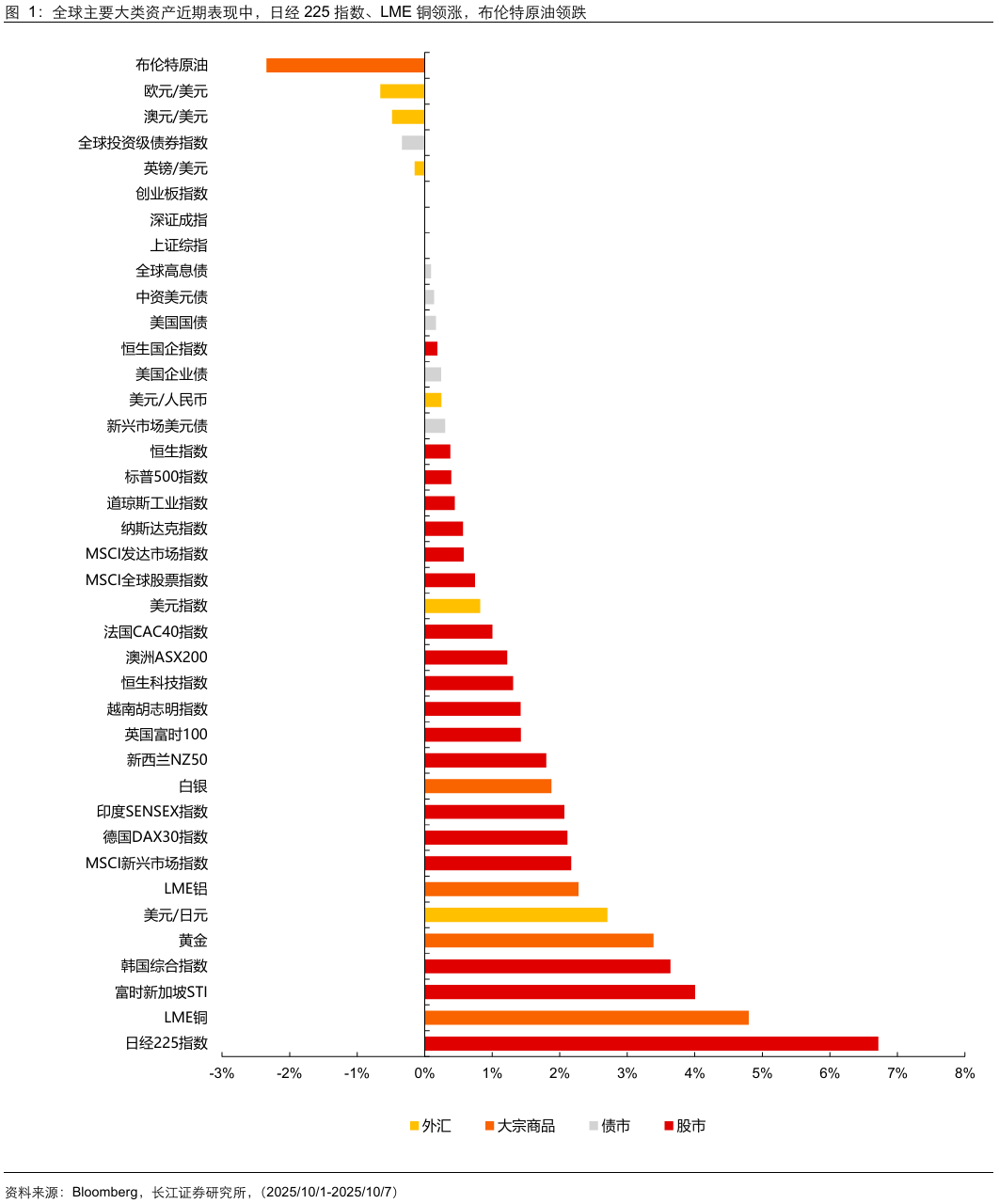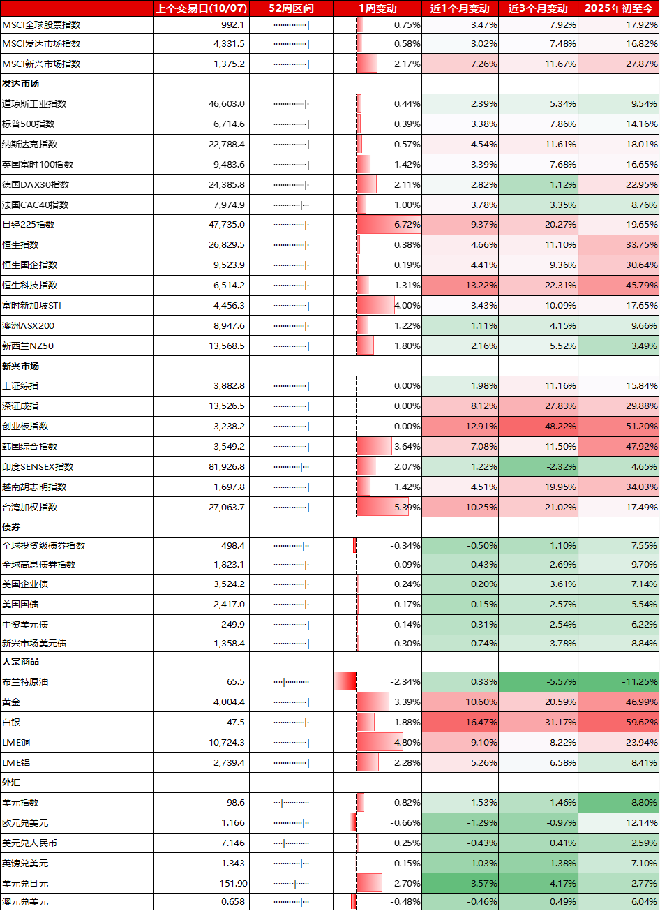 美股市场全线收涨,纳斯达克指数、道琼斯工业指数与标普500指数分别录得0.57%、0.44%和0.39%的涨幅。行业层面,Wind美国一级行业中,医疗保健(3.73%)、公用事业(2.76%)与信息技术板块(1.48%)表现领先,二级行业中煤炭Ⅱ(5.62%)、医药生物(4.90%)及钢铁Ⅱ板块(2.83%)涨幅居前。欧洲市场同步走强,德国DAX30、英国富时100及法国CAC40指数分别上涨2.11%、1.42%、1.00%。大宗商品方面,LME钴(11.33%)、LME铜(4.80%)、COMEX黄金(3.39%)领涨,而受OPEC+ 10月进一步增产预期影响,布伦特原油与纽约期油跌幅靠前。汇率方面,截至10月7日,美元指数收报98.58,周涨0.82%;美元兑离岸人民币报7.15,周涨0.25%。