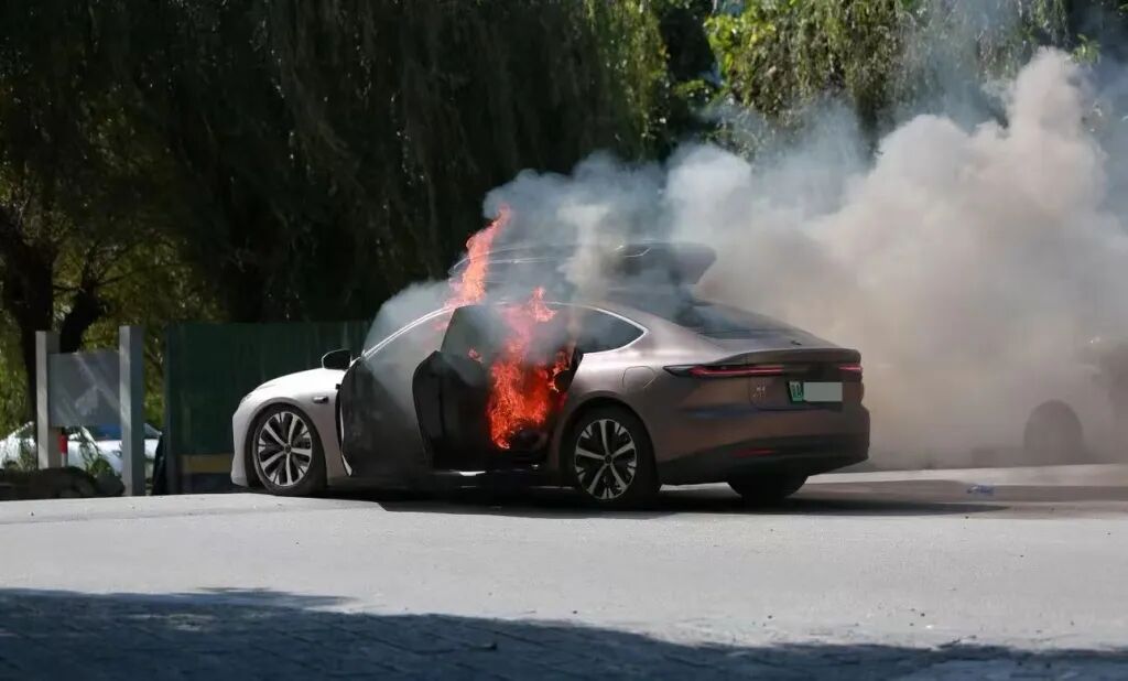 现场多段视频画面显示,一辆蔚来新能源轿车起火后燃烧猛烈并产生大量浓烟,副驾车门处于打开状态,消防救援人员正在用水扑救。