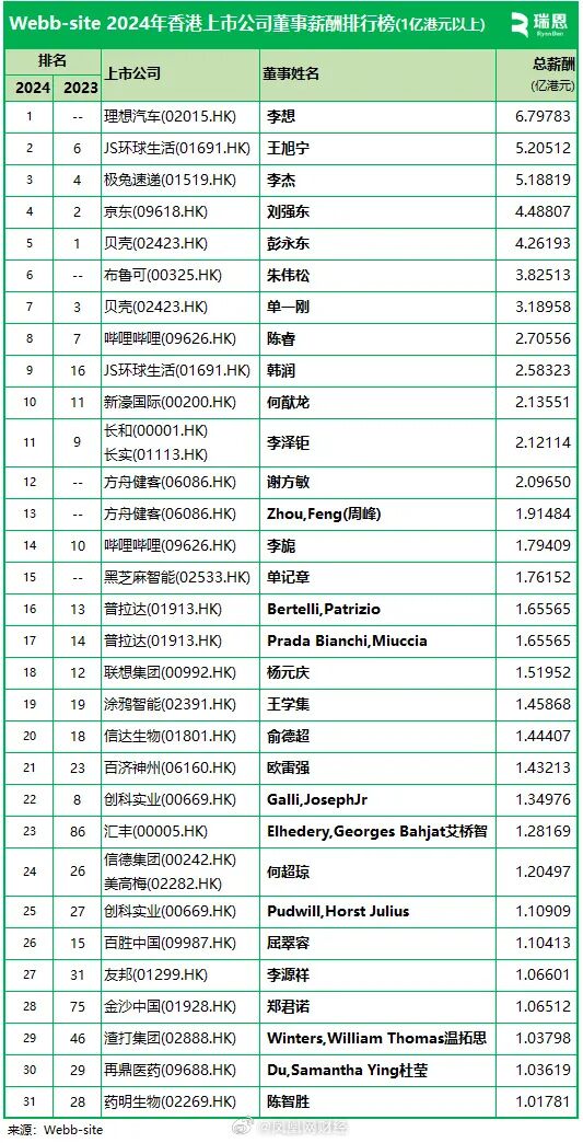 数据显示,其中31名董事2024年报酬逾1亿港元。理想汽车(02015.HK)创始人、董事长兼CEO李想以近6.80亿港元的总报酬位居榜首。
