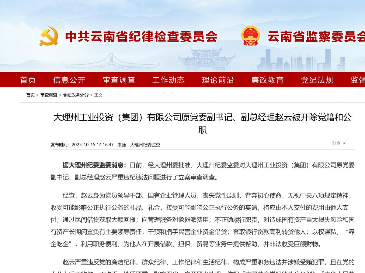赵云严重违反党的廉洁纪律、群众纪律、工作纪律和生活纪律,构成严重职务违法并涉嫌受贿犯罪,且在党的十八大后不收敛、不收手,性质严重,影响恶劣,应予严肃处理。依据《中国共产党纪律处分条例》《中华人民共和国监察法》《中华人民共和国公职人员政务处分法》等有关规定,经大理州纪委常委会会议研究并报大理州委批准,决定给予赵云开除党籍处分;由大理州监委给予其开除公职处分;收缴其违纪违法所得;将其涉嫌犯罪问题移送检察机关依法审查起诉。(昆明信息港AI平台生成)
