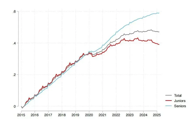 2025年,两位哈佛大学的经济学博士,在分析2015至2025年间覆盖超6200万员工、超1.5亿次的招聘就业数据后发现,生成式AI正以“资历偏向”的方式重塑劳动力市场。