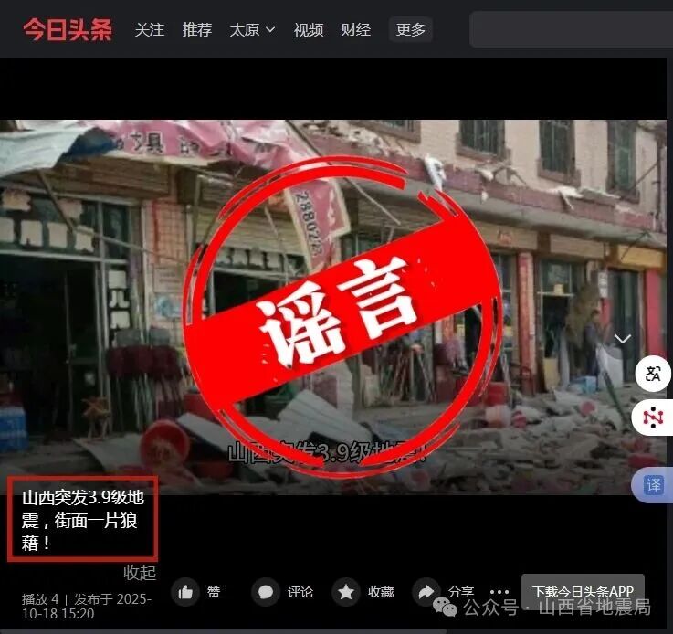 10月18日,有网民发布“山西突发3.9级地震,街面一片狼藉!”的信息,引发网民关注,经中国地震台网测定,在山西忻州市忻府区(北纬38.58度,东经112.50度)发生3.9级地震,震源深度10公里。经省市相关部门派出现场工作队赴震中地区调查,本次地震未造成人员伤亡和财产损失,震区社会秩序正常。