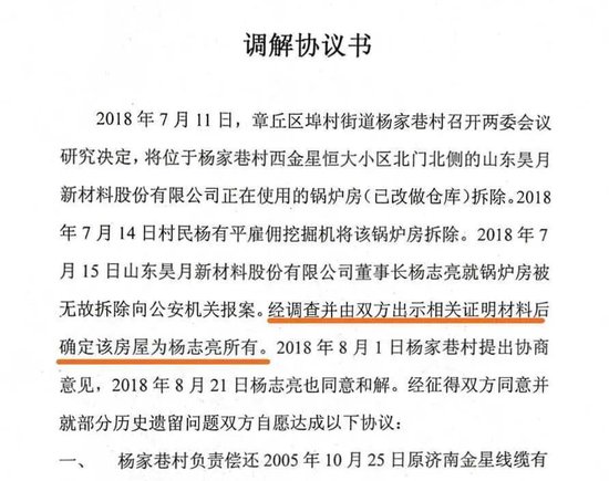 另一个细节是,案发后,警方曾组织双方进行过调解。落款时间2018年11月12日的《调解协议书》显示,经调查并由双方出示证据资料后确认,被强拆的锅炉房为杨志亮所有。