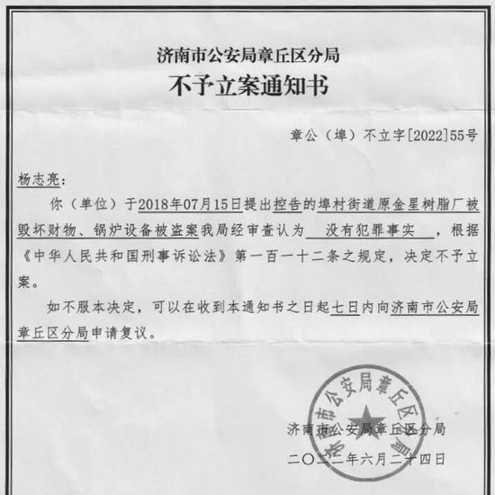 杨志亮不认同这份迟到4年的不立案决定,提出复议。2022年8月,章丘区公安分局作出复议决定,认为原决定认定的事实清楚、证据充分、依据准确、程序合法,维持原决定。