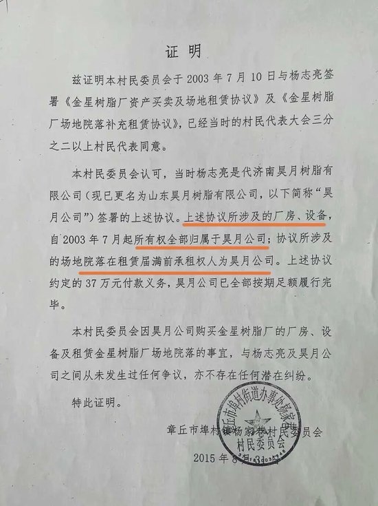 2003年,村里决定对树脂厂改制,将该厂资产中属于村集体所有的资产进行整体转让。当年7月,杨家巷村委与杨志亮签了《金星树脂厂资产买卖及场地租赁协议》(简称“厂资买卖租赁协议”),将树脂厂包括锅炉房在内的资产出售给杨志亮,场地租赁期限20年(后在补充协议中约定延长至2063年)。敲定后,双方还对上述协议进行了公证。