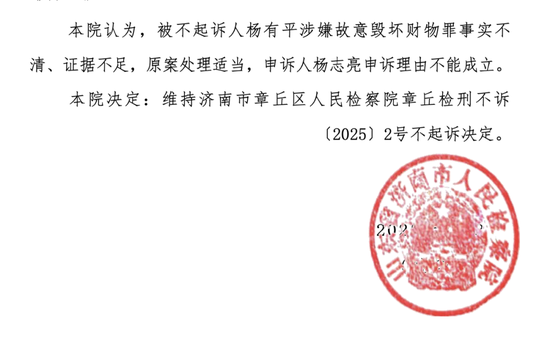 2025年1月10日,济南市章丘区检察院对杨有平作出《不起诉决定》,认为证实杨有平具有毁坏被害人财物的主观故意的证据不足,不符合起诉条件。