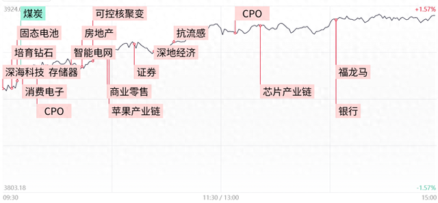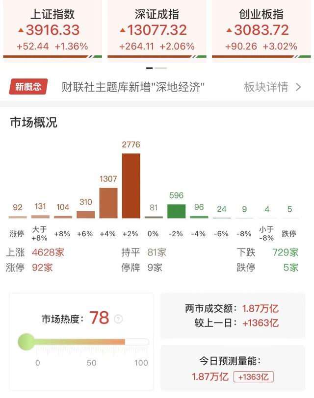 财联社10月21日讯,市场震荡反弹,创业板指涨超3%,沪指涨1.36%重返3900点。沪深两市成交额1.87万亿,较上一个交易日放量1363亿。盘面上,市场热点轮番活跃,全市场超4600只个股上涨。深地经济概念持续走强,神开股份、石化机械双双2连板。CPO概念股全天走强,“易中天”光模块三巨头震荡拉升,源杰科技触及20cm涨停创历史新高。苹果产业链表现活跃,环旭电子涨停,工业富联大涨。下跌方面,煤炭股走弱,安泰集团大跌。截至收盘,沪指涨1.36%,深成指涨2.06%,创业板指涨3.02%。