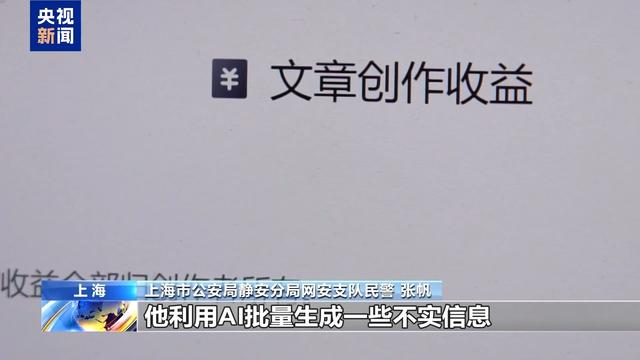上海市公安局静安分局网安支队民警 张帆:他利用AI批量生成一些不实信息,再通过他购买到的一些网络小号来传播这些不实信息。通过制造一些爆款内容,增加这些小号的浏览量,最终达到获取流量的目的。