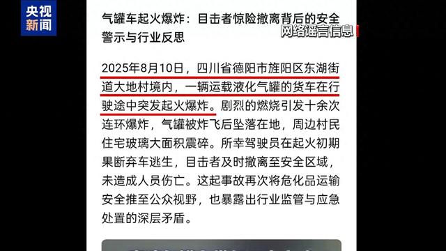 声称2025年8月10日,四川省德阳市旌阳区东湖街道大地村境内,一辆运载液化气罐的货车在行驶途中突发起火爆炸。这篇文章不仅对爆炸现场进行了详细描述,还附有一张货车燃烧、群众撤离的图片。在文章后半部分还分析了事故造成的损失、相关部门的救援措施等,并称“由于事发路段狭窄,消防通道被私家车占用,导致救援设备进场延误10分钟”。乍一看,非常真实,文章内容也引起了网民的关注和讨论。