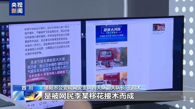 德阳市公安局网安支队四大队副大队长 王周木:我们在互联网上以图搜图开展核实,这张图片其实是前一天发生在青兰高速上,气罐车发生爆炸事件的视频截图,是被网民李某移花接木而成,这是彻彻底底的谣言。他(李某)这样发文章是为了吸粉、博眼球、博流量。