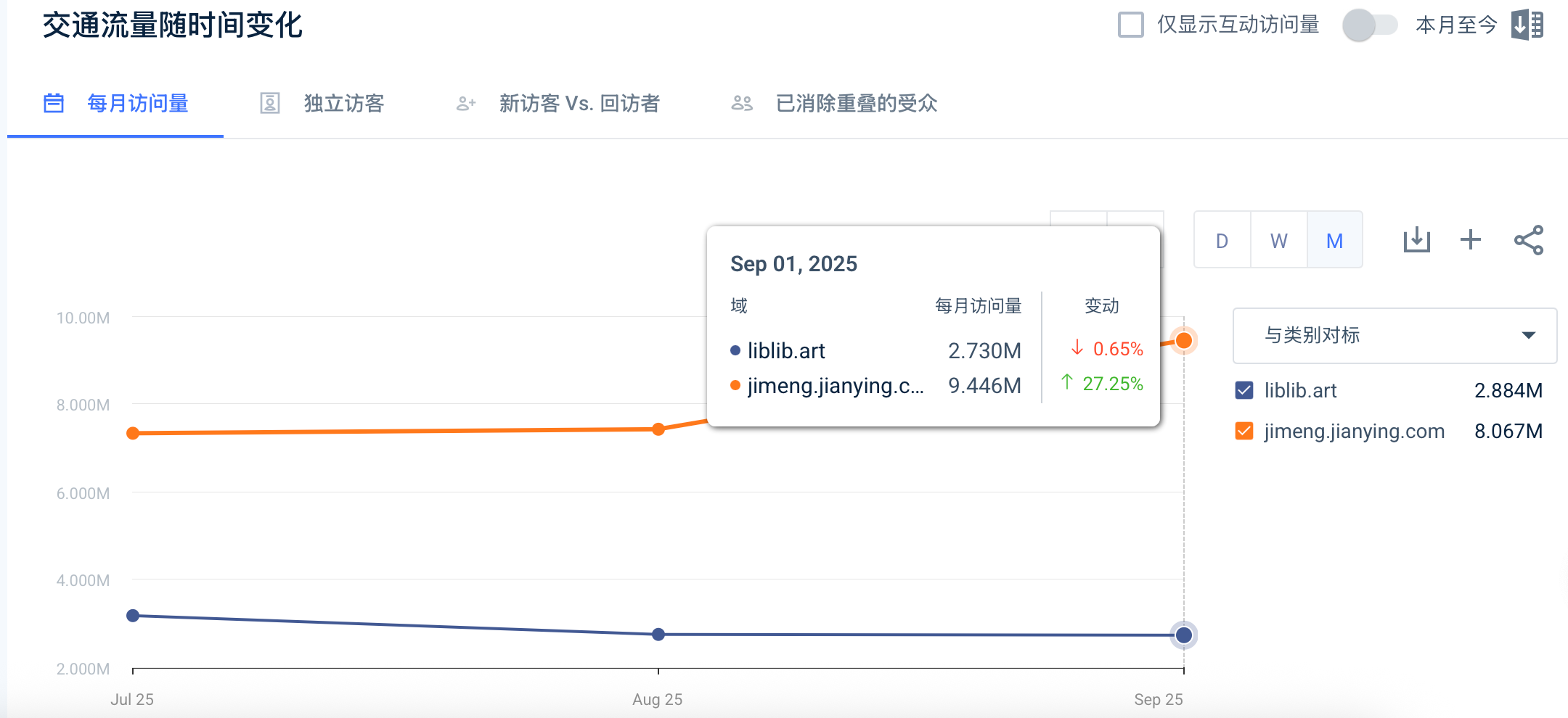 但这并非易事,技术迭代持续发生,行业竞争实时更新。对比liblibAI与字节跳动旗下即梦AI,两者属于同一赛道内的不同打法选手。前者侧重“模型超市+专业工作流”,后者侧重“自研模型+一键消费级体验”。字节体系的算力与社交平台给到即梦AI更多的资源支持。据SimilarWeb,liblibAI九月访问量273万,下滑0.63%;即梦AI访问量944.6万,上涨27.25%。