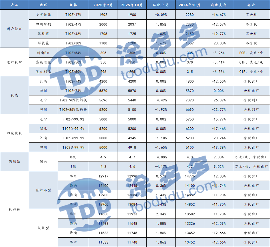 10月钛矿市场整体维稳,月初大厂个别价格上调;截止本月底,38钛矿不含税报价在1150-1250元/吨,46,10钛矿不含税价格在1700-1750元/吨,47,20矿报价1800-2050元/吨。本月攀钢原矿外发量增加,但市场原料增加不多,水选厂开工仍不足;下游钛白市场走弱,成本压力不减,部分新单成交僵持;月初大厂价格上调后,周边中小厂多观望,价格持稳;目前钛矿需求整体看未有下滑,但同时钛矿供应也没有明显缺货,市场供需双弱,钛矿成本价格依旧坚挺,但后期下游产品市场恐有下行预期,预计后期钛矿部分价格或趋弱运行。