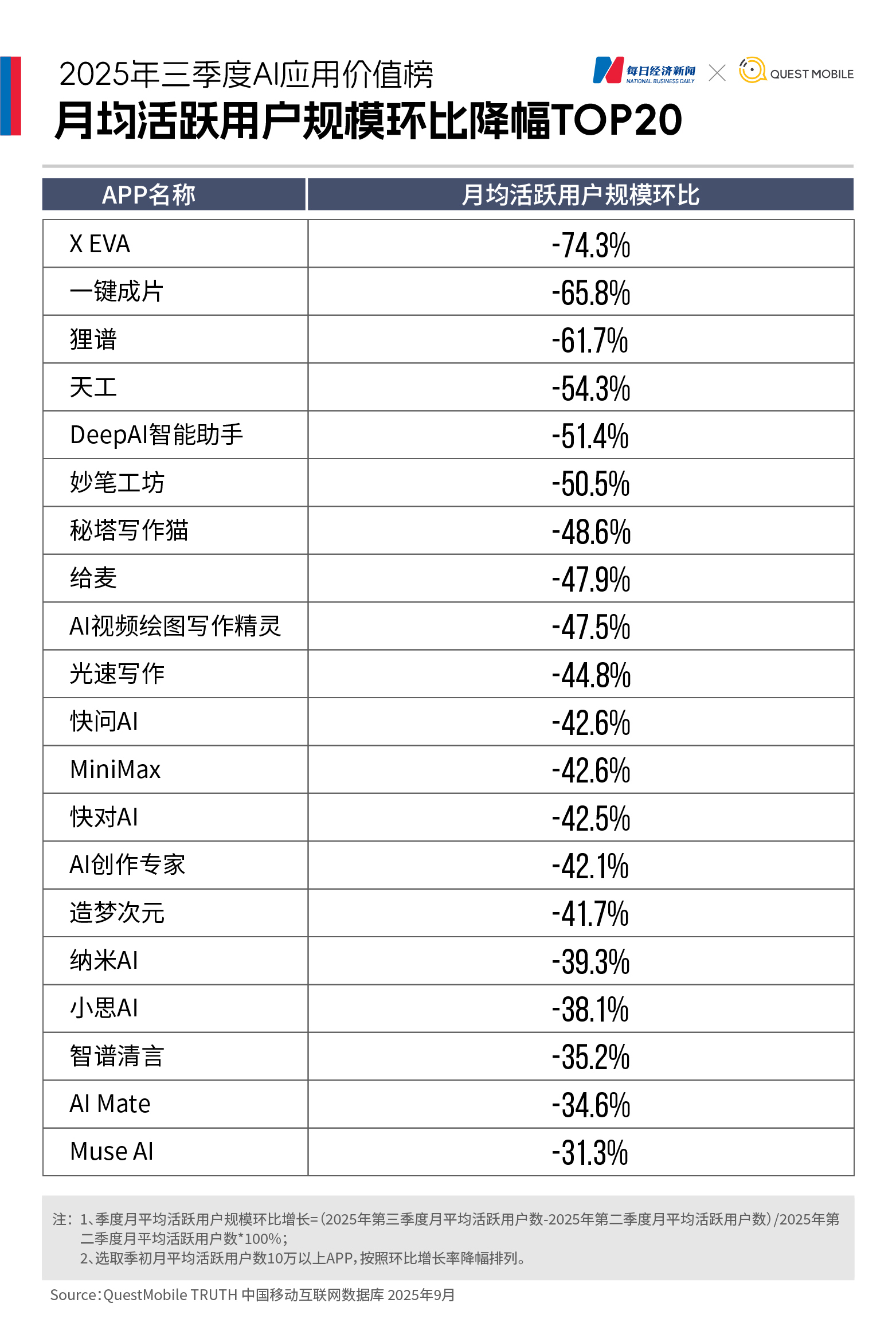 2025年第三季度,AI应用市场呈现出明显的两极分化。《每日经济新闻》联合QuestMobile推出《2025年三季度AI应用价值榜》,基于月均下载量与月活跃用户数(以下简称“月活”)两大核心指标,揭示AI应用“下半场”的新变局。