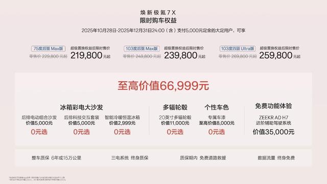 2025年10月28日至12月31日(含)期间支付5,000元定金的大定用户,全系赠送价值12,999元的冰箱彩电大沙发,全系免费升级20英寸265mm宽胎以及专属车漆,并可享价值35,000元的ZEEKRAD H7进阶辅助驾驶系统终身免费功能体验。 与此同时,首任极氪老车主增换购焕新极氪7X可享每年1000度的5年免费充电权益。此外,2025年11月30日(含)前,下定且锁单的用户,如因极氪原因,无法在2025年开票交付,导致无法全额享受购置税优惠,对于政策退坡产生的差额,极氪品牌提供至高13,500元的购车尾款抵扣。