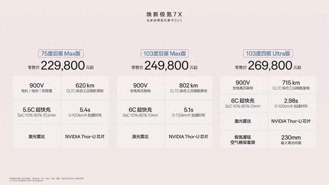 焕新极氪7X在高价值、好口碑的基础上,在空间、性能、安全、智能四大维度豪华进阶,全系搭载900V电机、电控及热管理系统,全系标配5.5C或6C超快充,全系标配激光雷达及算力高达700TOPS的Thor-U辅助驾驶芯片,全系标配137项豪华配置,重塑全球家庭豪华SUV新标杆。