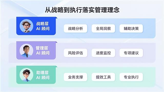 这一层次的AI Agent主要负责协助企业高层开展战略分析,通过提供全局业务的洞察和辅助决策能力,为企业高管们的决策提供辅助指导。