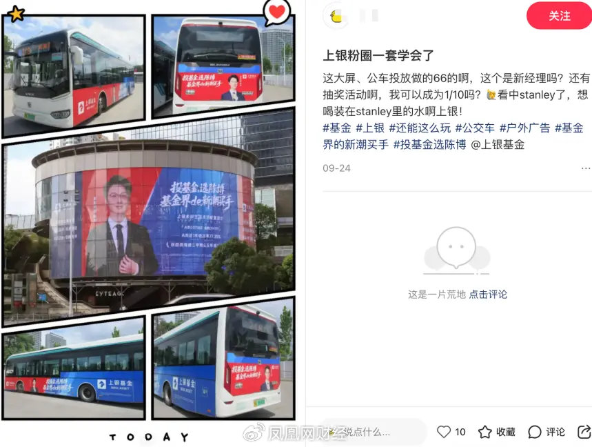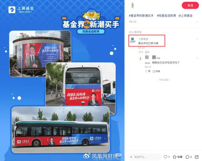 上银基金近期在上海市许多商城外墙和公交车上投放巨幅广告,海报画面上印有上银基金经理陈博的大幅头像,配以“投基金,选陈博,基金界的新潮买手”标语。同时,上银基金官方社媒还推出抽奖活动,邀请用户围绕上述话题参与讨论。