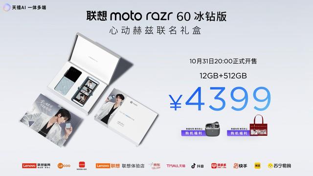 联想moto razr 60心动赫兹联名礼盒售价4399元,购买心动赫兹礼盒的用户即有机会获得“赫你相遇”限定礼袋,礼袋含张凌赫独家写真透卡、定制款痛包,以及丰富的限定周边。