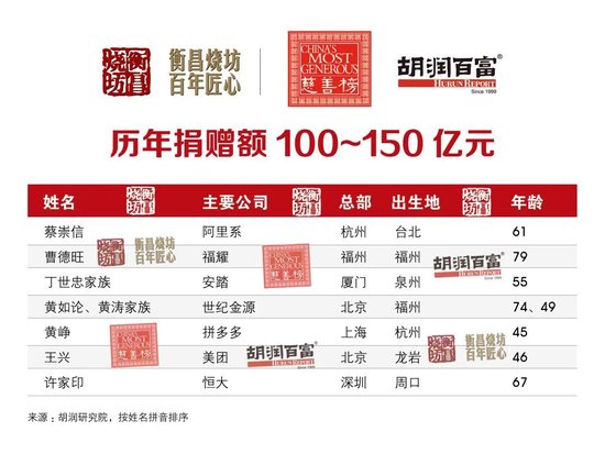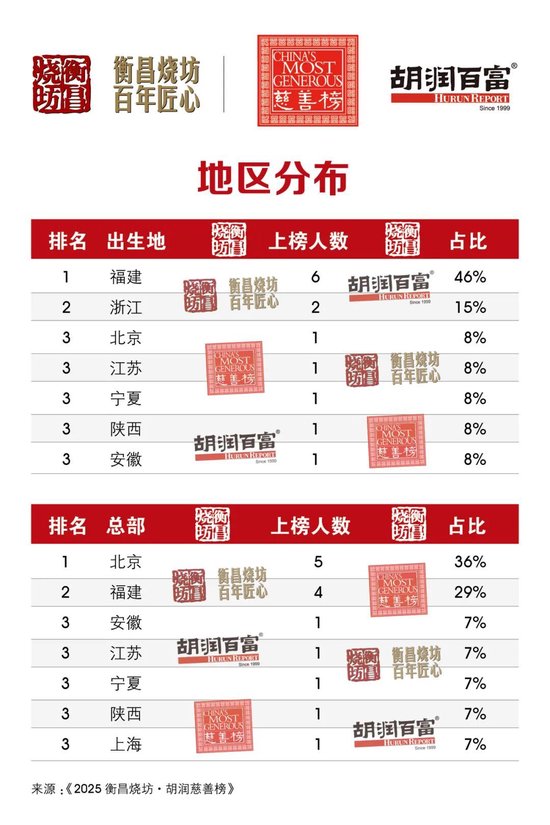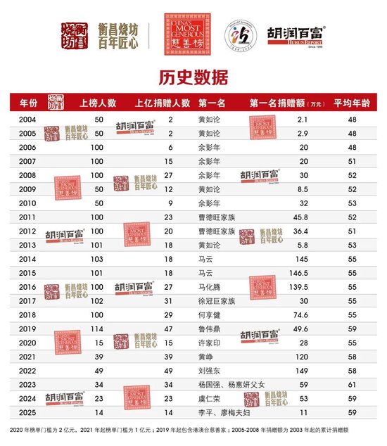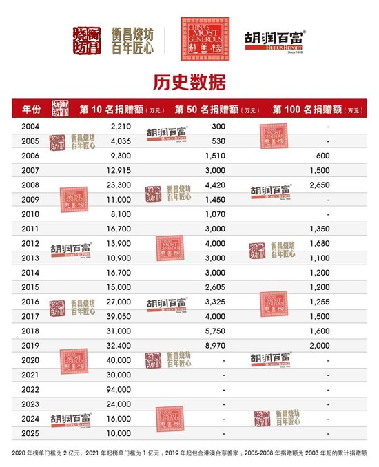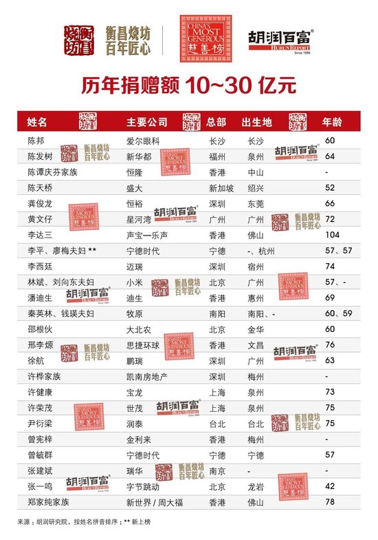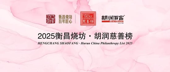 (2025年11月4日,上海)提供有质量的榜单与调研的胡润研究院,携手高端酱香白酒品牌衡昌烧坊,今日联合发布《2025衡昌烧坊·胡润慈善榜》(HENGCHANG SHAOFANG · Hurun China Philanthropy List 2025)。2024年9月1日至2025年8月31日期间的现金和股权捐赠,以及有法律效力的承诺捐赠都统计在内。2025年8月31日至榜单发布日期间的1亿元以上大额捐赠,也计入本次统计。今年是胡润研究院连续第二十二次发布“胡润慈善榜”。