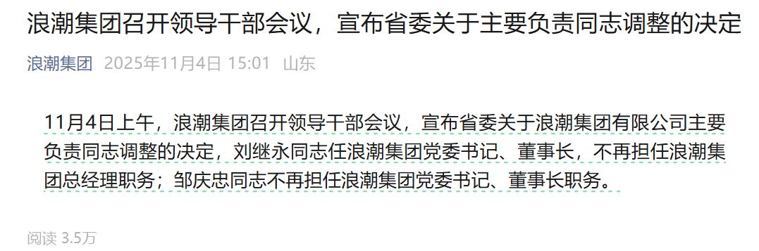 据浪潮集团公众号,11月4日上午,浪潮集团召开领导干部会议,宣布省委关于浪潮集团有限公司主要负责同志调整的决定,刘继永同志任浪潮集团党委书记、董事长,不再担任浪潮集团总经理职务;邹庆忠同志不再担任浪潮集团党委书记、董事长职务。