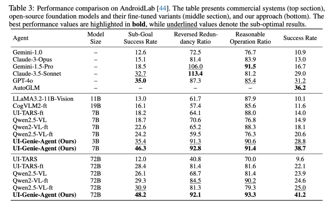 在 AndroidLab 的 138 个真实任务上,UI-Genie 的平均成功率显著高于商用与开源模型。其 3B 版本已能对标 7B 级别基线,7B 模型甚至超过部分 70B 级模型。