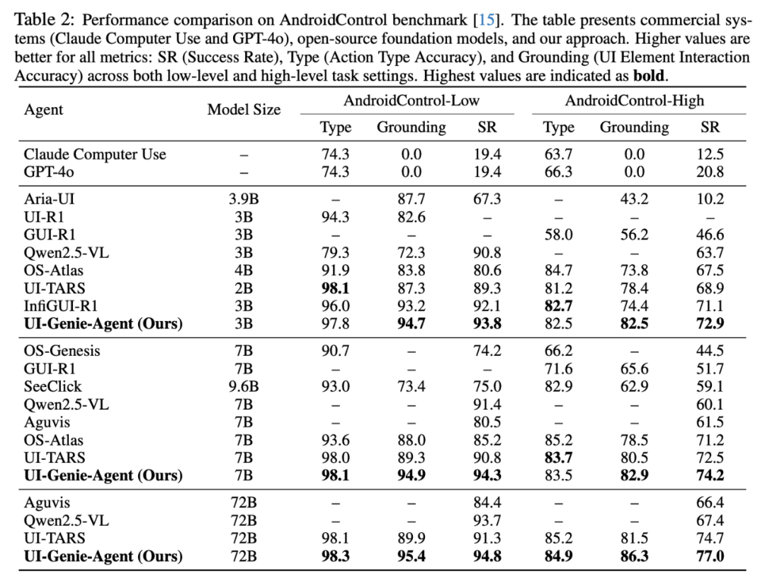 在 AndroidControl 基准上,UI-Genie 在任务成功率(SR)与元素定位准确率(Grounding)上全面超越基线方法。其中 72B 模型在高级任务指令下取得 86.3% 的定位准确率与 77.0% 的操作成功率,体现了在奖励模型引导下更精准的 UI 理解能力和步骤规划能力。