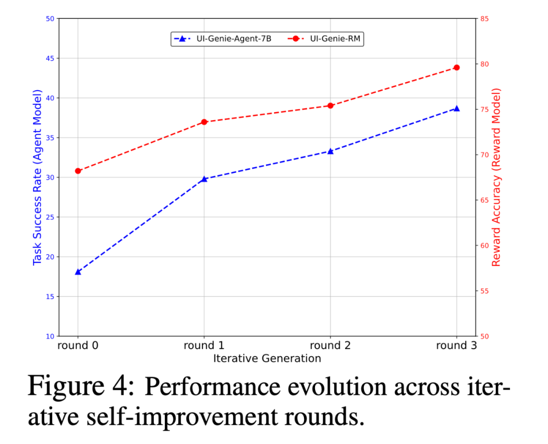 在包含 1050 对样本的综合基准上,UI-Genie-RM 在步骤级与结果级评估中均表现最佳。实验同时验证了自我进化过程的有效性:经过三轮迭代,智能体在 AndroidLab 上的任务成功率从 18.1% 提升至 38.7%,奖励模型准确率从 68.2% 提高到 79.6%。