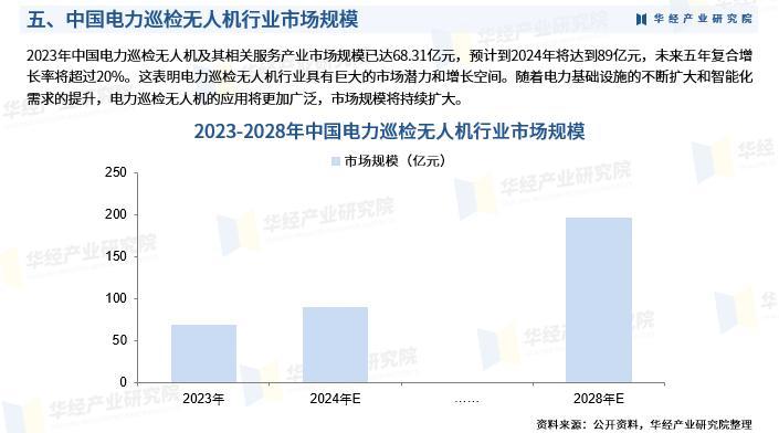 2023年中国电力巡检无人机及其相关服务产业市场规模已达68.31亿元,预计到2024年将达到89亿元,未来五年复合增长率将超过20%。这表明电力巡检无人机行业具有巨大的市场潜力和增长空间。