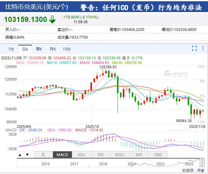 在经历了一周的下跌后,比特币价格在当地时间11月7日尾盘企稳反弹,价格回升至10.3万美元上方,但仍较10月6日创下的12万美元纪录高点下跌约18%。