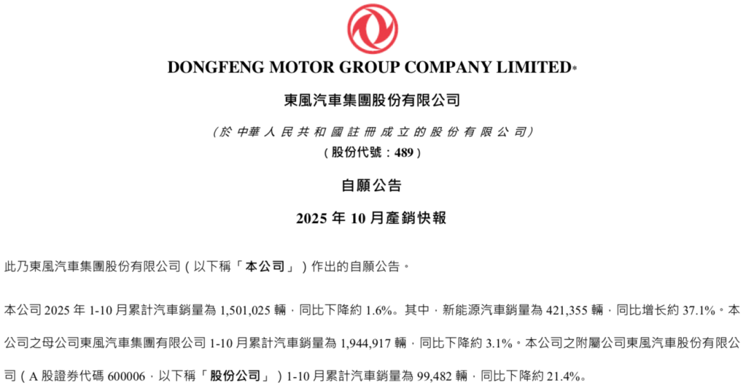 11月6日,东风汽车集团股份有限公司(下称“东风汽车集团”)发布2025年10月以及2025年1-10月销量数据。数据显示,10月东风汽车集团销量为18.43万辆,同比增长16.2%。其中,新能源汽车销量为5.94万辆,同比增长47.6%。截至10月底,今年前10月东风汽车集团累计销量为150.10万辆,同比下滑1.6%。其中,新能源汽车累计销量为42.14万辆,同比增长37.1%。