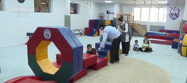 在辽宁沈阳这家托育中心,10多名1至3岁的宝宝正在早教老师带领下做感统游戏。不满两岁的轩轩是托小班的“进步之星”。2024年7月入托时,他还是个见到陌生人就躲到老师身后的“害羞宝宝”,如今他不仅能主动向小伙伴挥手打招呼,还会主动分享玩具。