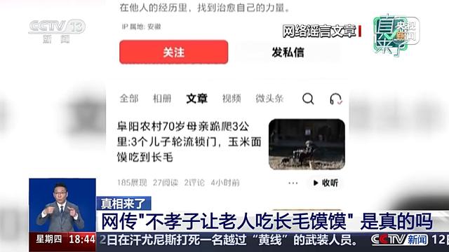 除了自然灾害,一些容易引发舆论关注的家庭矛盾,比如养老、婚恋等,也是造谣者热衷的领域。前段时间,安徽阜阳“不孝子”让老人吃长毛的玉米面馍馍的谣言就造成了不小的影响。
