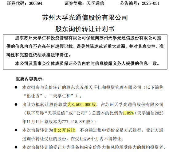 根据公告,本次询价转让股份的数量为850万股,占天孚通信总股本的比例为1.09%,转让原因为自身资金需求。价格方面,本次询价转让的价格下限为不低于发送认购邀请书之日(即11月14日,含当日)前20个交易日天孚通信股票交易均价的70%。
