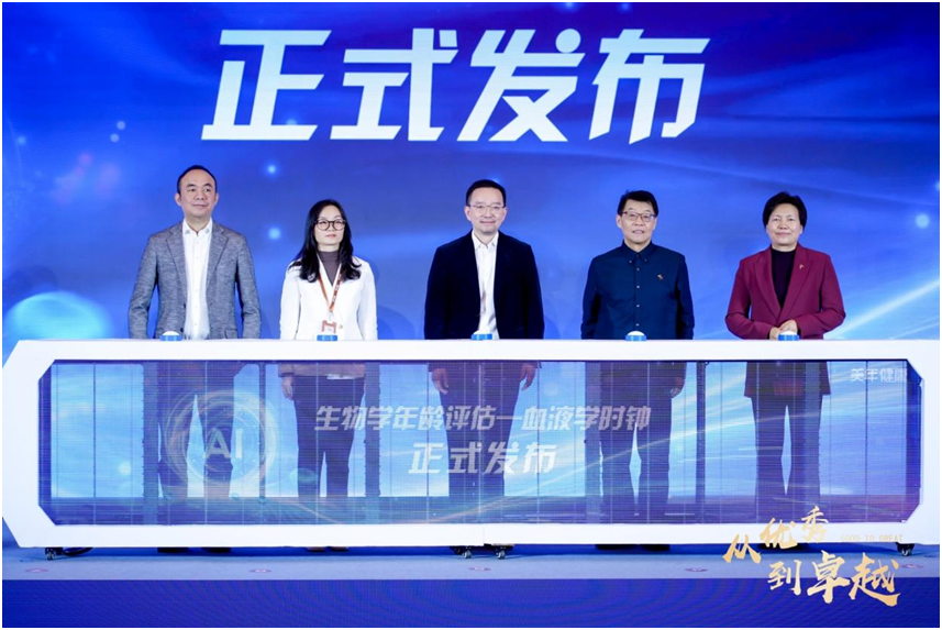 发布会现场举行了“生物学年龄评估—血液学时钟”产品发布仪式。清华大学生命科学学院长聘教授、教育部信息及系统生物学重点实验室主任、协和医院双聘教授邓海腾教授,美年健康集团董事长俞熔,美年健康集团副董事长郭美玲,美年健康集团总裁徐涛,菲鹏集团高级副总裁、抗衰板块执行董事曹菲共五位嘉宾出席了发布仪式。