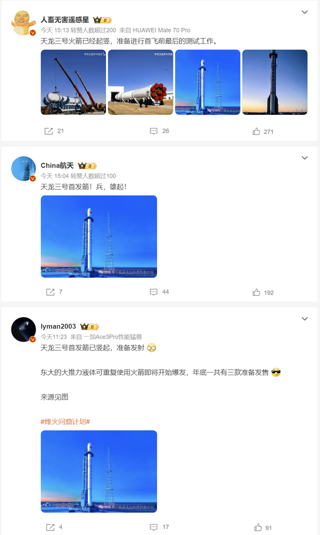 近期,天龙三号与蓝箭航天旗下的朱雀三号将先后开启发射任务,让我们静候佳音。